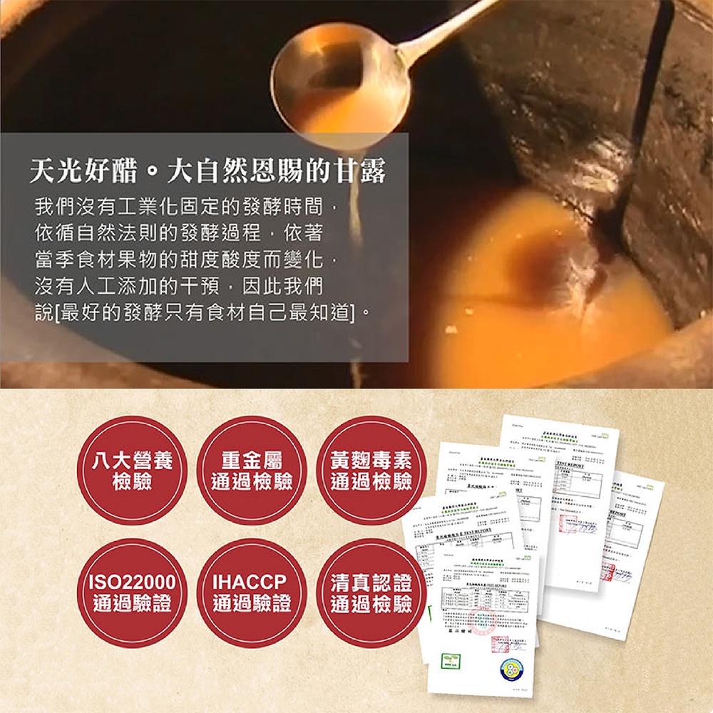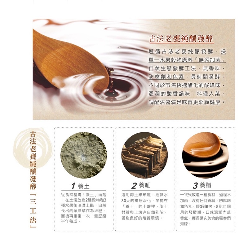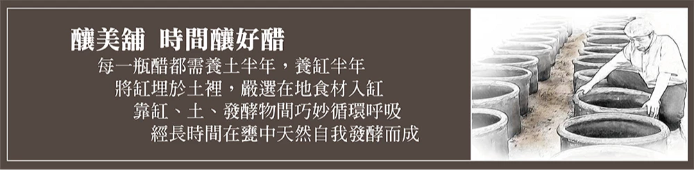 光陰堆疊才有的時光滋味,釀美舖好醋,得先養土半年,養缸半年,將缸半埋於好土中,再把單一食材放入缸,倚靠著陶缸,一片好土和食材之間的自然運行,經過8-36個月、多次轉化,才能釀得一口豐華韻味。