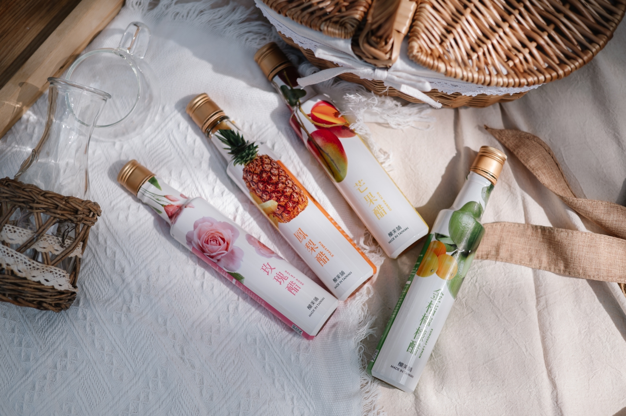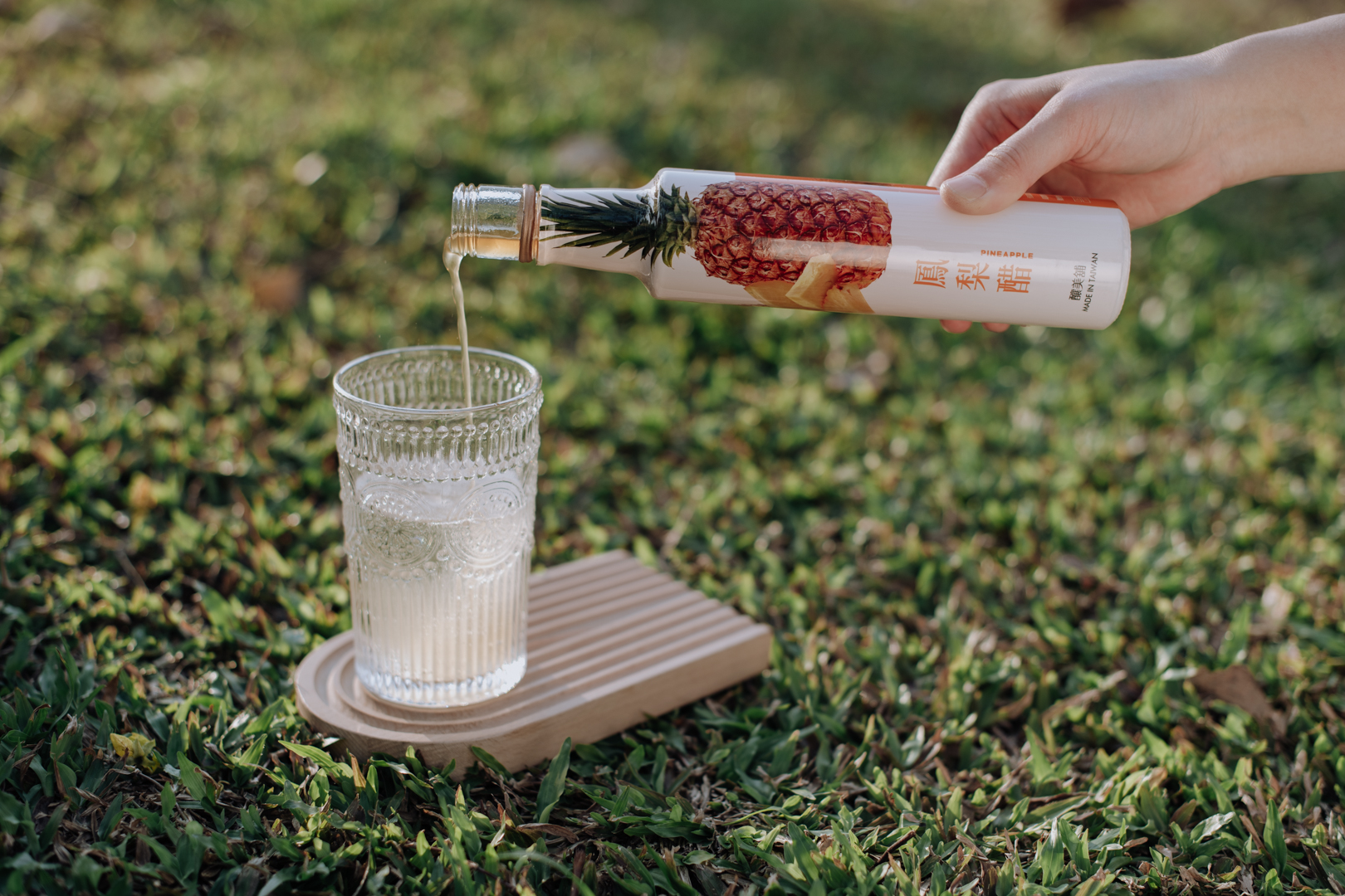 使用熟成後的關廟鳳梨,加入天然發酵而成的有機糙米醋揉合,使用熟成工法帶出全養分鳳梨的天然本味,再按黃金比例將甜度升至防腐甜度,完美結合出「鳳梨醋」。