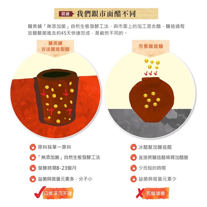 醋是現今的健康飲品,醋中含多種胺基酸和有機酸,對人體有非常多的益處。釀美舖堅持做最好的醋,精選台灣在地食材,並以熟成古法釀造,不做任何的人工催化、不植入任何醋酸菌種,果香溫潤,不嗆口,保有豐富有機酸和多酚,是您健康養生及送禮的好選擇!