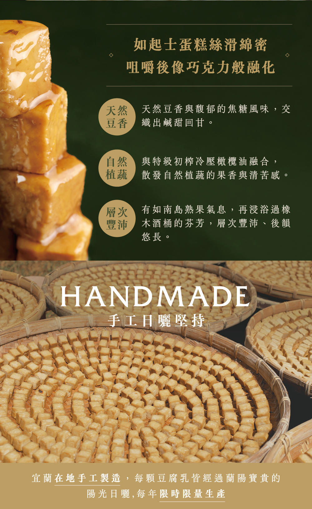 宜蘭在地手工製造,每一顆豆腐乳皆經過蘭陽寶貴的陽光日曬,每年限時限量生產。