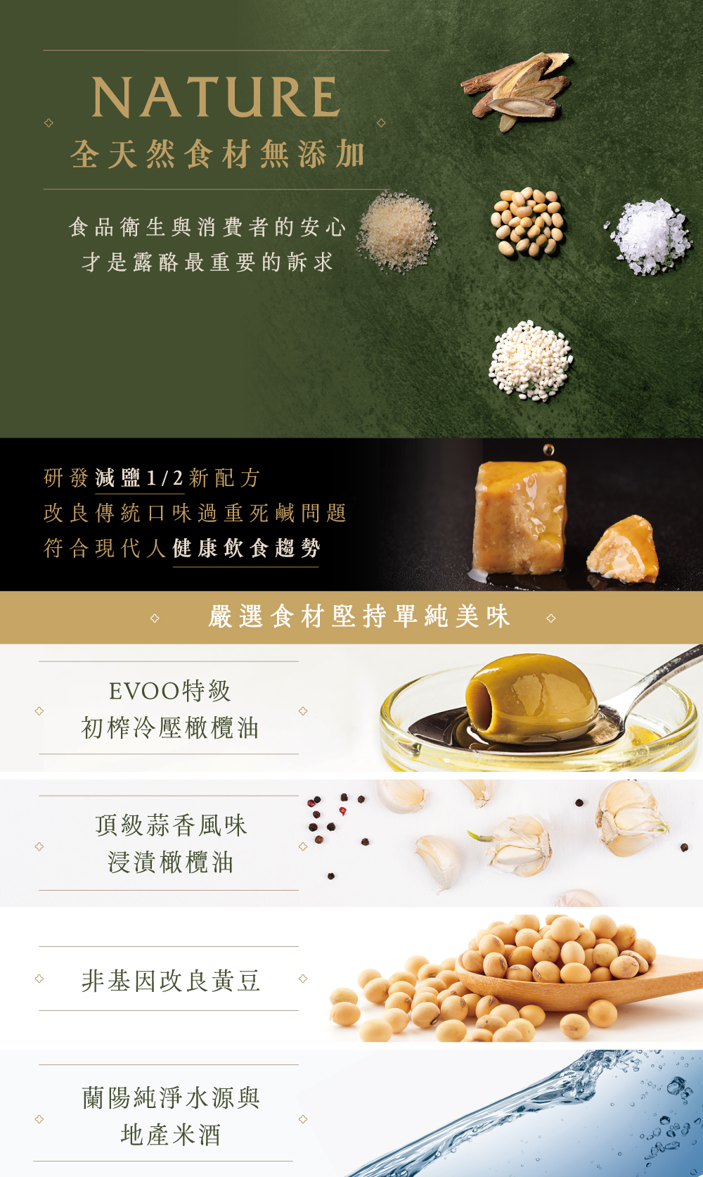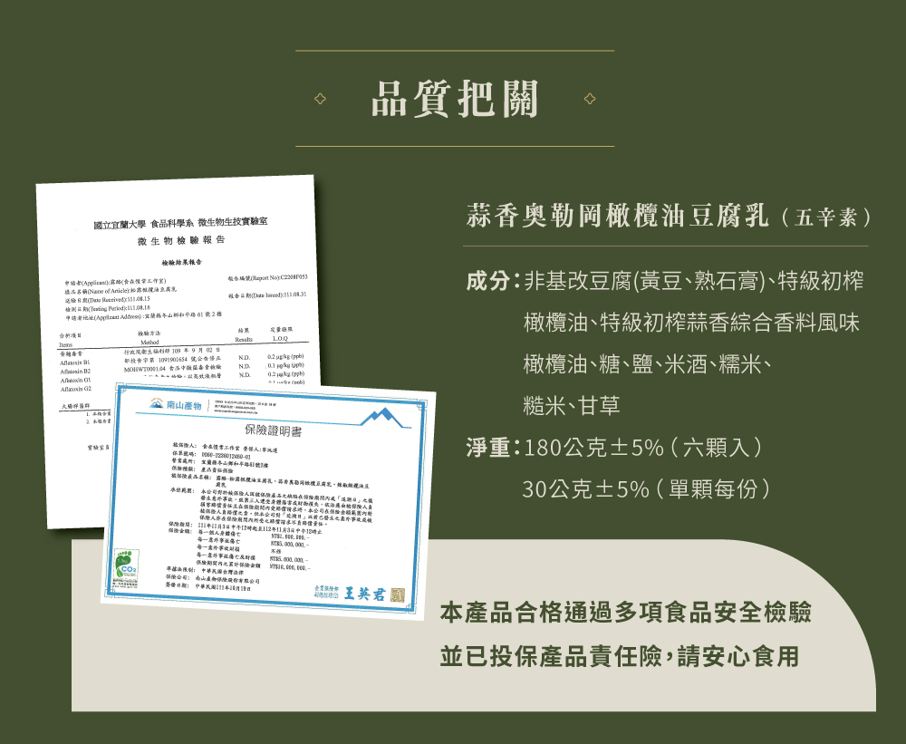 成分:非基改豆腐(黃豆、熟石膏)、特級初榨橄欖油、特級初榨蒜香綜合香料風味橄欖油、糖、鹽、米酒、糯米、糙米、甘草。
